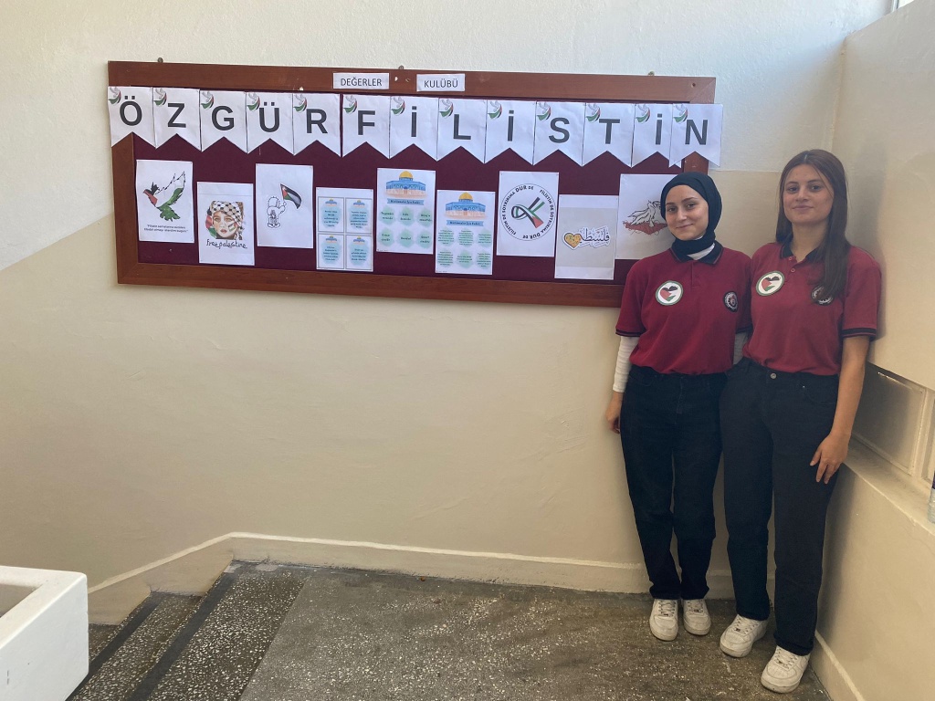 Değerler Kulübü olarak, öğrencilerimizin Filistin halkının maruz kaldığı insan hakları ihlallerine yönelik eleştirel düşünme ve sorumluluk bilinci geliştirmeleri, evrensel barış değerlerini içselleştirmeleri ve insan haklarına duyarlı küresel vatandaşlar olarak yetişmeleri amacıyla pano çalışması ve yaka kartları hazırlanarak etkinlikler düzenlenmiştir.
